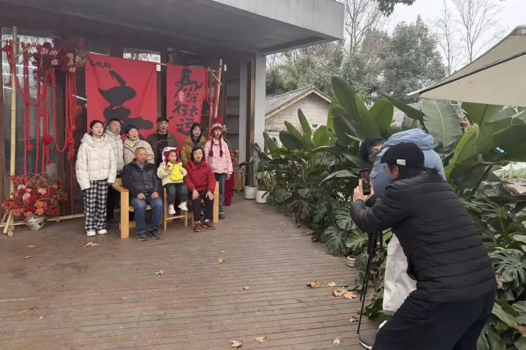 这不是专业的影楼,而是一场践行“温江一家亲”理念的免费全家福拍摄活动现场。活动的发起人正是大蒜咖啡的创始人戴超,他特地在自己的社区空间搭建起摄影点,为高山村的新老村民记录新春的团圆时刻。