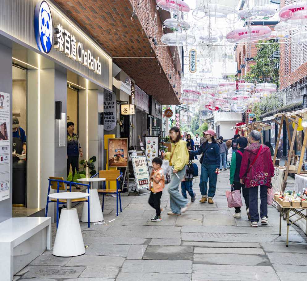 温江文庙·印巷以社学巷为轴线,改建了包含原粮食局大院、高炮营大院、光祈读书处等建筑,植入新型商业多元化业态于其中,打造具有市井烟火气的街区商业,实现了从古老街巷到现代文化地标的华丽转身。每逢节假日期间,这里总是人声鼎沸、热闹非凡,而长年累月的商贩吆喝声——“王鸡肉”已成为这条街的声音符号。
