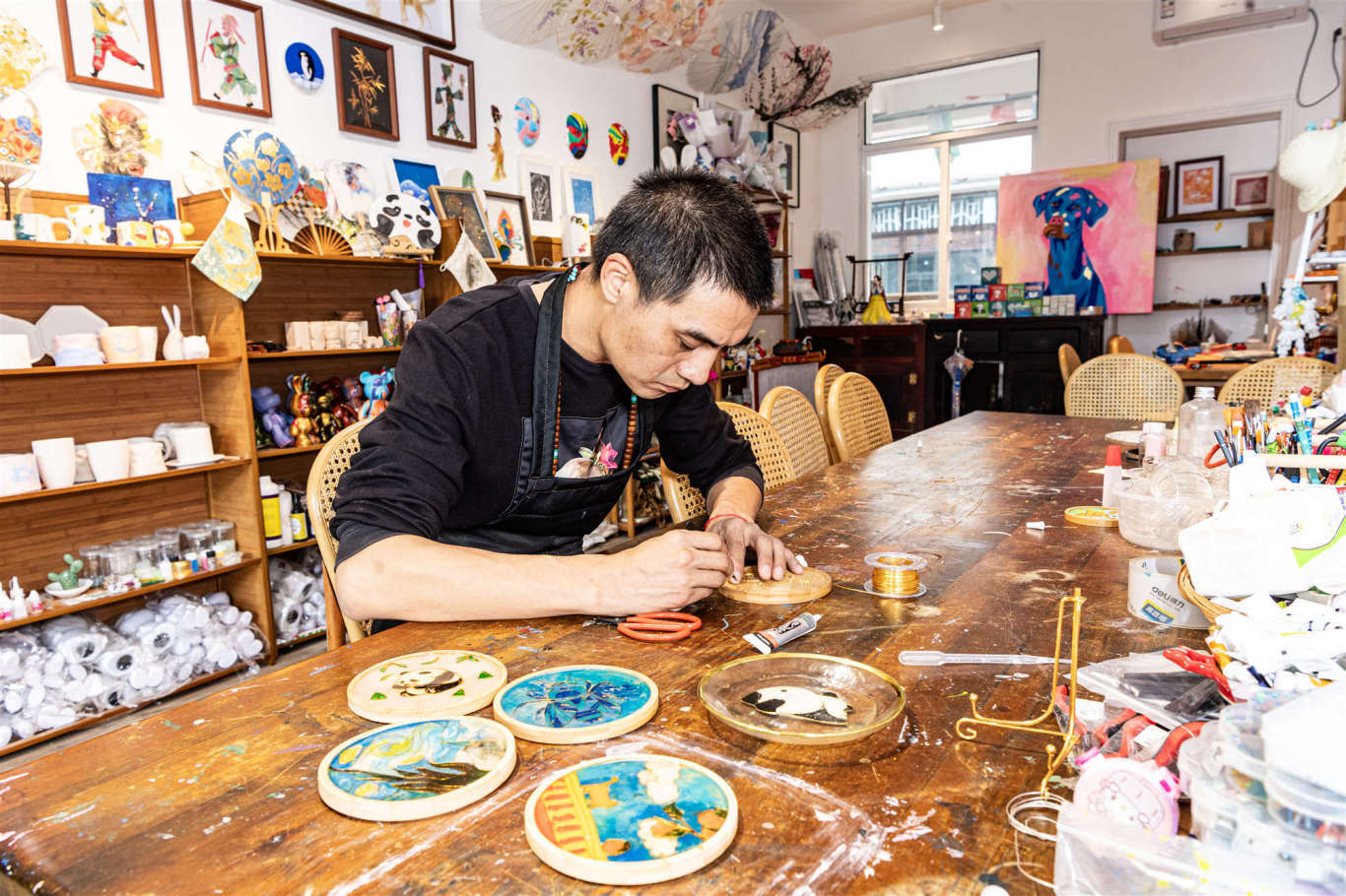 除了有这些消费场景,这个街巷更具艺术文化气息。这个由防空洞改建而成的不潮艺术馆里,红砖墙上时常挂满了各类主题画展、摄影作品展等,与防空洞自有的复古气息融合成独特的艺术打卡氛围。另外文庙·印巷还有各类手作DIY的店铺,还能在这里亲手制作竹编团扇、掐丝珐琅、珠串......快带着孩子们来感受下不一样的艺术氛围吧~
