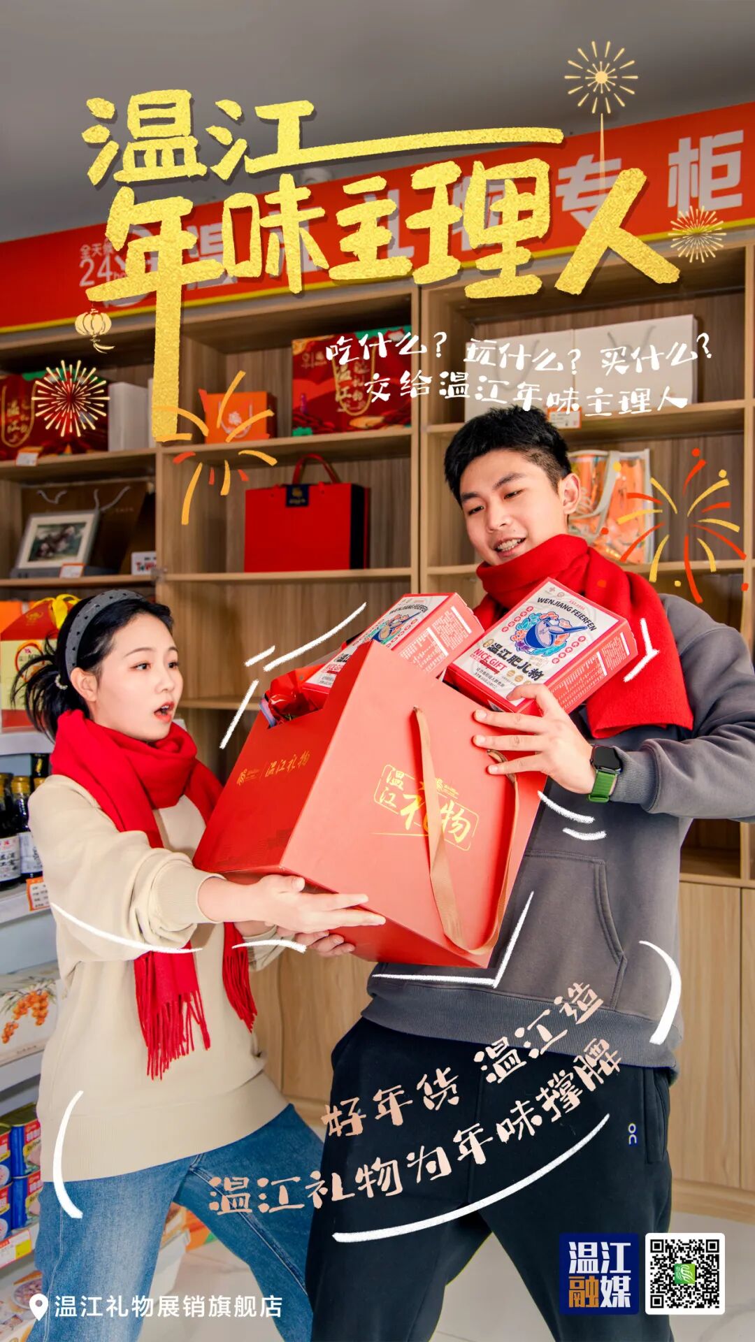 温江礼物展销旗舰店位于鲁家滩湿地公园游客中心。这里汇集了 “温江礼物” 3大类29个产品,涵盖食品、文创、电子产品等。更让年轻人惊喜的是,这里是24小时智慧无人超市,扫描二维码进店选购商品,离店后系统自动从手机上扣款,科技元素满满。快来花式买年货吧。