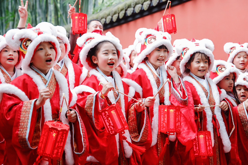 2月3日,成都武侯祠博物馆里,一群身穿喜庆红装的小使者笑颜绽放,用清脆响亮的童声送上马年祝愿:“祝大家春风得意事事顺,马到功成日日新!”这些活泼可爱的孩子,正是今年武侯祠成都大庙会上最受喜爱的“吉祥小使者”----他们带着满满祝福,为成都的新春增添了浓浓的欢乐与祥瑞。